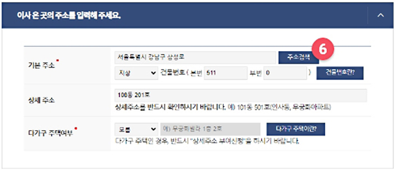 ⑥ 먼저 주소검색을 클릭하여 새로 이사 온 곳의 주소를 불러온 뒤 나머지 상세주소를 입력합니다.