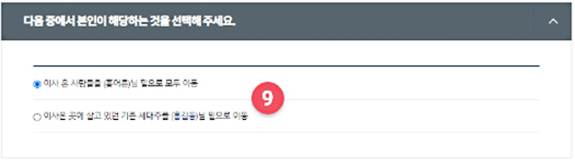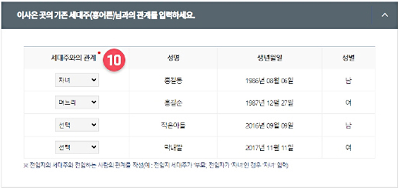 ⑩ 이사온 사람과 (새로 이사 온 곳의) 기존 세대주와의 관계를 선택하세요.