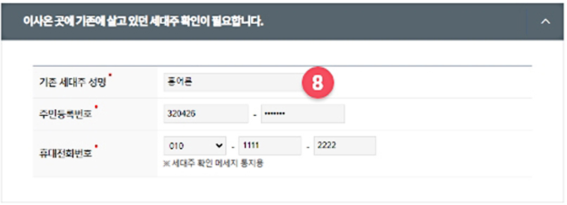 ⑧ 기존에 살고 있던 세대주 정보를 입력하세요. 신청인과 전입지 세대주가 다른 경우 '전입지세대주확인용' 메시지가 발송됩니다.