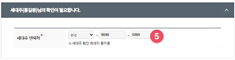 ⑤ '세대주 확인 메세지 통지'를 위해 세대주(이사 전에 살던 곳)의 연락처를 입력한 후, 다음단계를 클릭하세요(신청인이 세대주가 아닌 경우 입력)